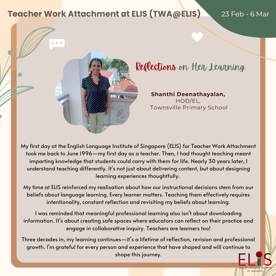 TWA@ELIS is a Leader Growth Programme designed to grow English Language Lead Teachers (LTs/EL) and Senior Teachers (STs/EL) professionally with guidance from Principal Master Teachers (PMTTs), & Master Teachers (MTTs) and Senior Specialists (SSs) of English Language in ELIS.